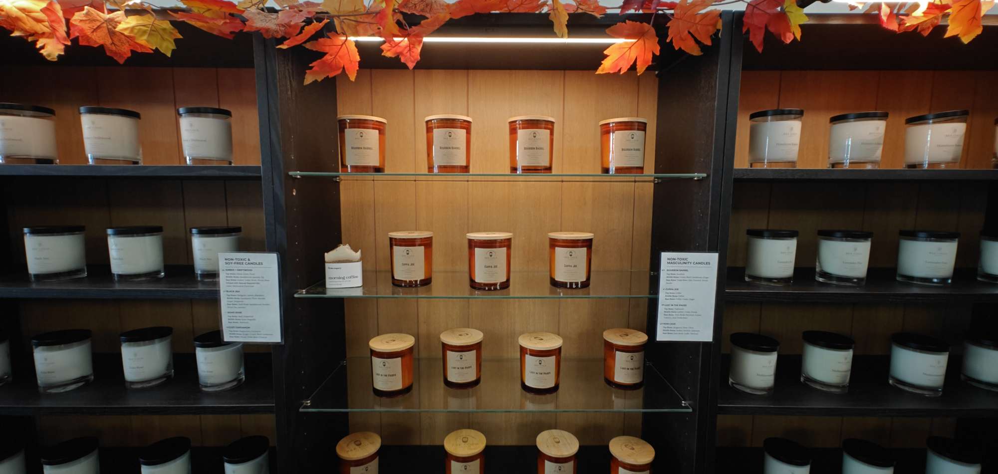 The store features a wide range of scented candles, beeswax melts, tea lights, and body balms.