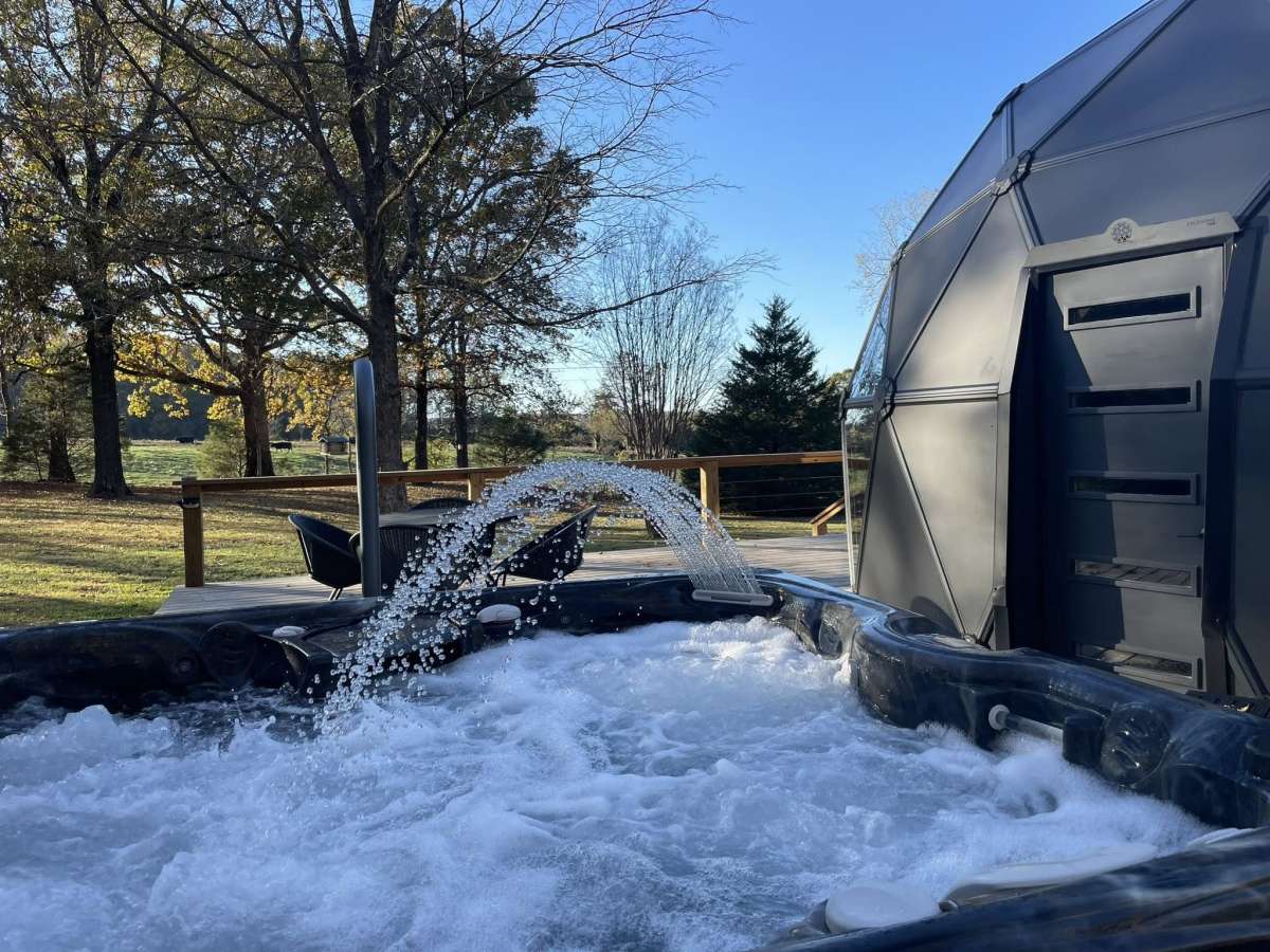Escape to The Dome At Blueberry Hill, a unique glamping experience featuring: private hot tub, luxury bathroom, kitchenette and vintage game barn. Two queen beds have stargazing views under the climate controlled geodesic dome. Perfect for a romantic getaway or peaceful escape to enjoy nature in comfort and style!